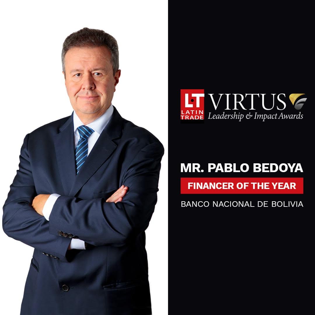 QAMASA Digital.- Pablo Bedoya Sáenz, presidente de Directorio del Banco Nacional de Bolivia S.A. (BNB), recibió el premio ‘Financer of the year’ en la primera edición de los «Latin Trade Virtus Leadership Impact Awards», que se realizó el 10 de octubre en Miami.