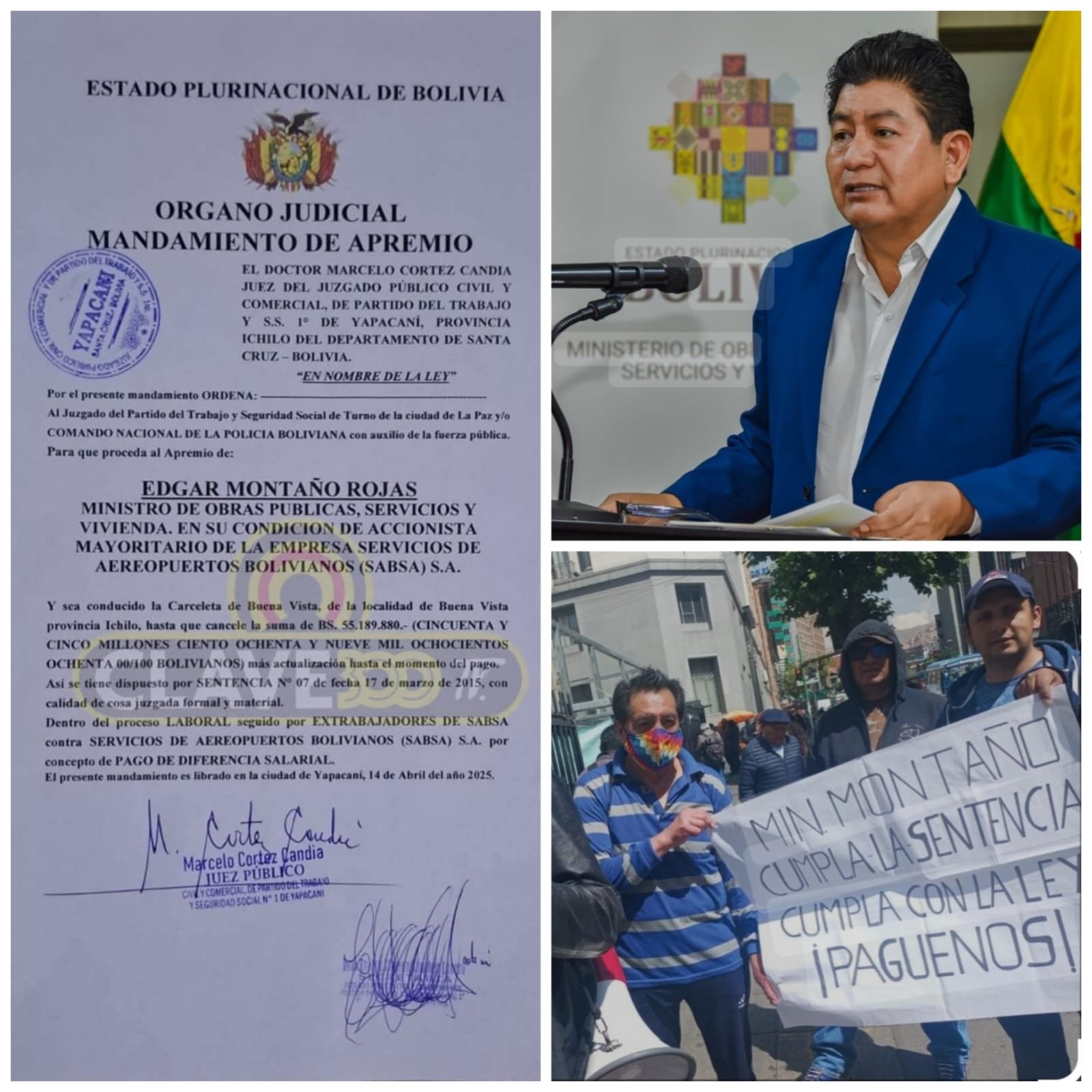 Santa Cruz, Bolivia/QAMASA Digital.– El abogado de los extrabajadores, José Antonio Mozza informó que el juez del Juzgado Público Civil y Comercial de Partido de Trabajo y Seguridad Social Primero de Yapacaní, Marcelo Cortez Candia, emitió este lunes 14 de abril un mandamiento de apremio y de arraigo contra el ministro de Obras Públicas, Edgar Montaño Rojas, a fin de que realice el pago de más de Bs 55 millones a favor de los extrabajadores de SABSA.