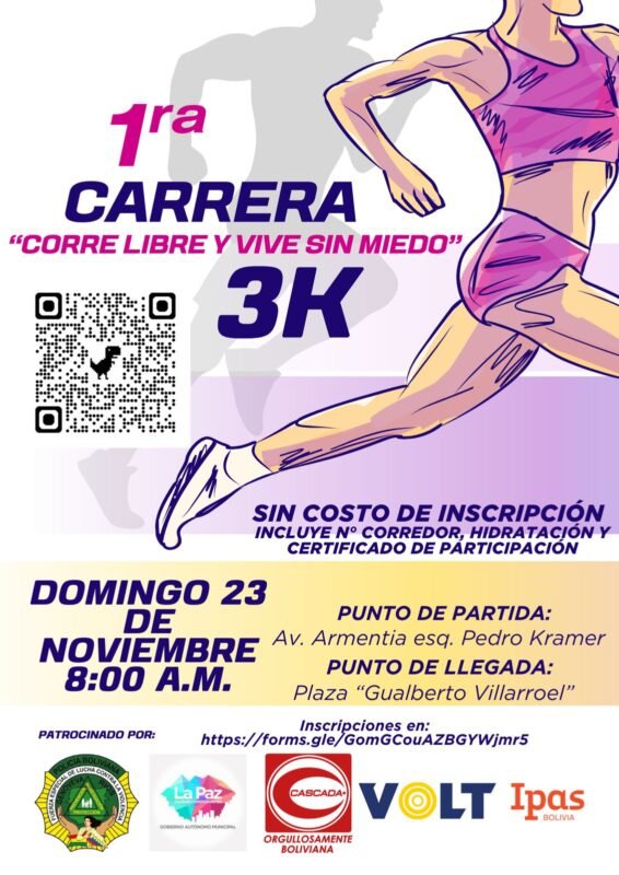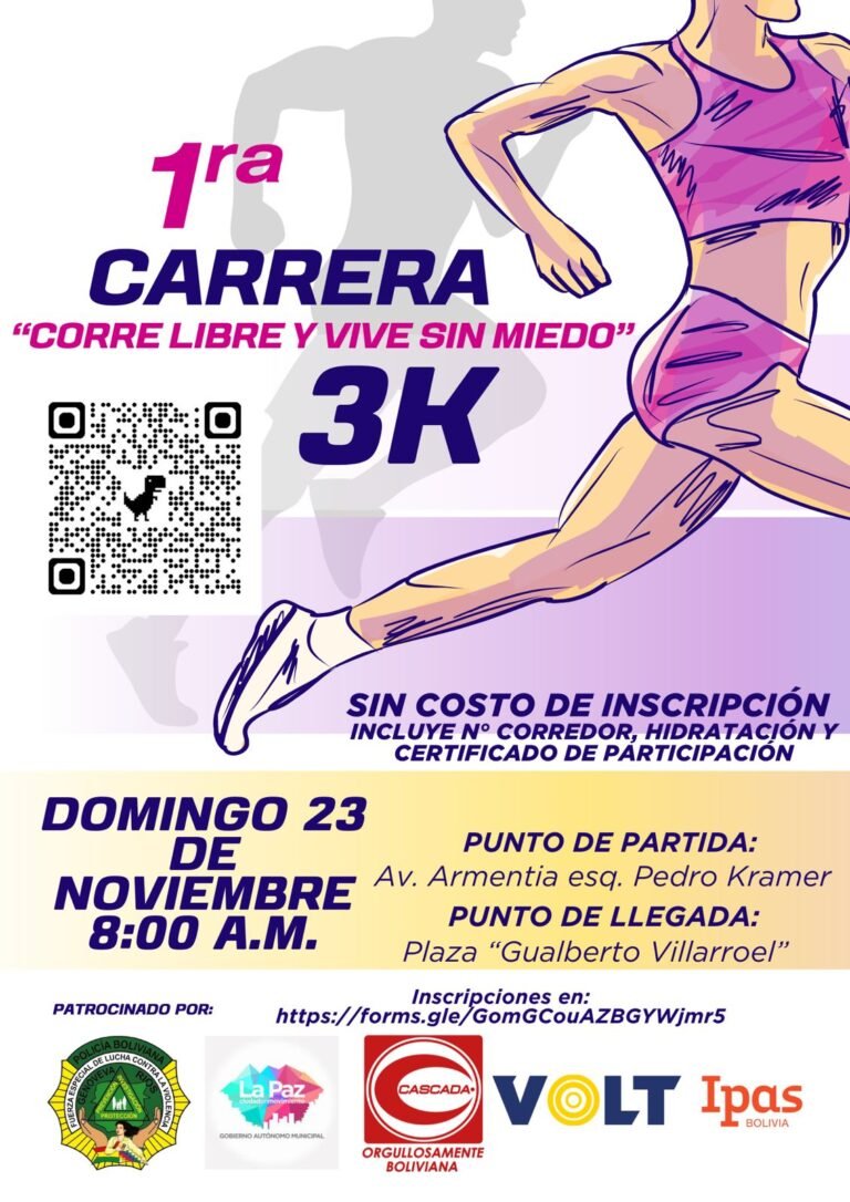 La Paz, Bolivia/QAMASA Digital.- La Subalcaldía Centro invita a la primera carrera pedestre “Corre libre y vive sin miedo 3K”, un evento que busca unir a la comunidad en torno a la actividad física y la lucha contra la violencia hacia las mujeres, en vísperas del Día Internacional de la Eliminación de la Violencia contra la Mujer.