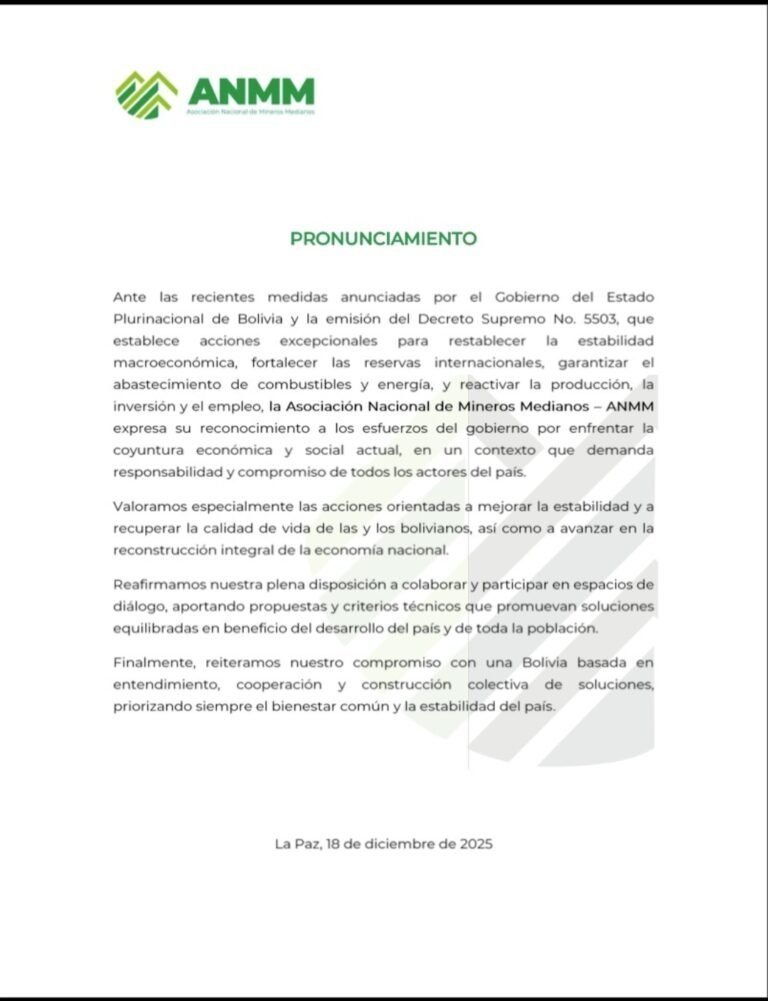 La Asociación Nacional de Mineros Medianos (ANMM) expresa su reconocimiento a los esfuerzos del gobierno por enfrentar la coyuntura económica y social actual, en un contexto que demanda responsabilidad y compromiso de todos los actores del país.