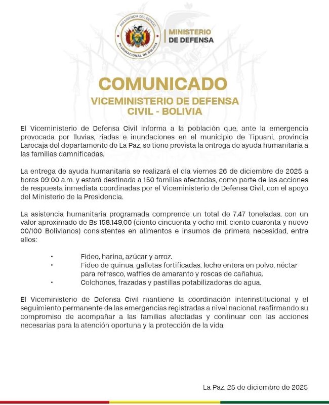 La entrega de ayuda humanitaria se realizará el día viernes 26 de diciembre de 2025 a horas 09:00 a.m. y estará destinada a 150 familias afectadas, como parte de las acciones de respuesta inmediata coordinadas por el Viceministerio de Defensa Civil, con el apoyo del Ministerio de la Presidencia.