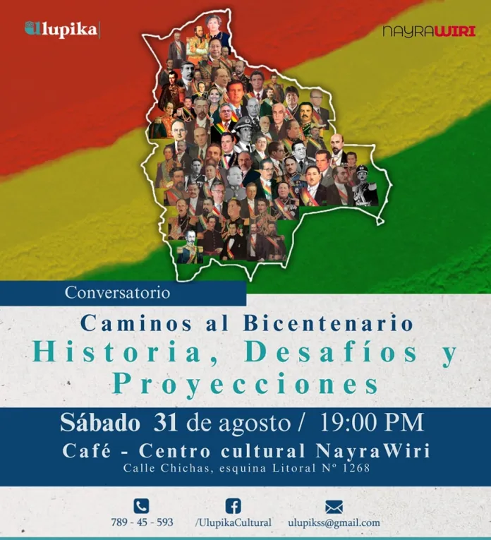 “A medida que nos acercamos al 200 aniversario de nuestra independencia, es esencial reflexionar sobre los pasos que hemos dado como nación y los retos que aún nos esperan. Te invitamos a un conversatorio único, donde exploraremos la historia de Bolivia desde la emblemática declaración del 6 de agosto de 1825, analizaremos nuestros logros y desafíos a lo largo de estos 199 años, y proyectaremos una visión esperanzadora hacia el Bicentenario en 2025 y más allá”, señala la publicación del movimiento Ulupika en sus redes sociales.