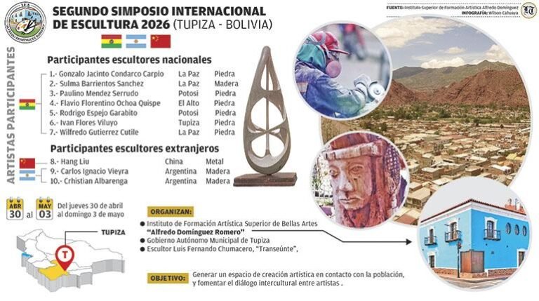 Tupiza, Bolivia/QAMASA Digital.- Un total de diez escultores de tres países tomarán parte del Segundo Simposio Internacional de Escultura que se celebrará en Tupiza, Potosí, del jueves 30 de abril al domingo 3 de mayo.