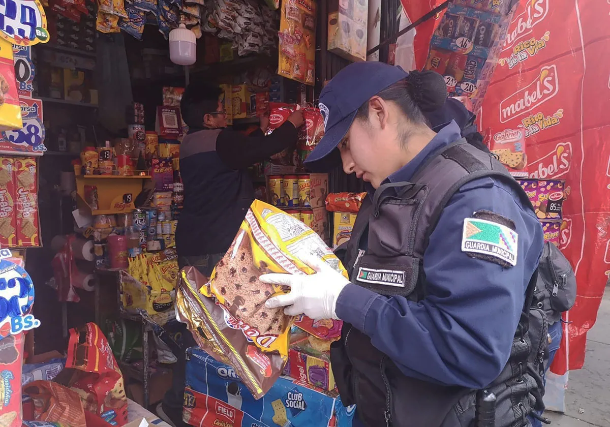 Elalto, Bolivia/QAMASA Digital.- Panetones, sidras y otros productos con fechas caducadas, sin registro sanitario que son nocivos para la salud fueron decomisados este jueves por el personal de la Intendencia y la Guardia Municipal en un operativo que se hizo en la avenida Tiwanaku y la calle Rodolfo Palenque del Distrito 1 de la ciudad de El Alto.