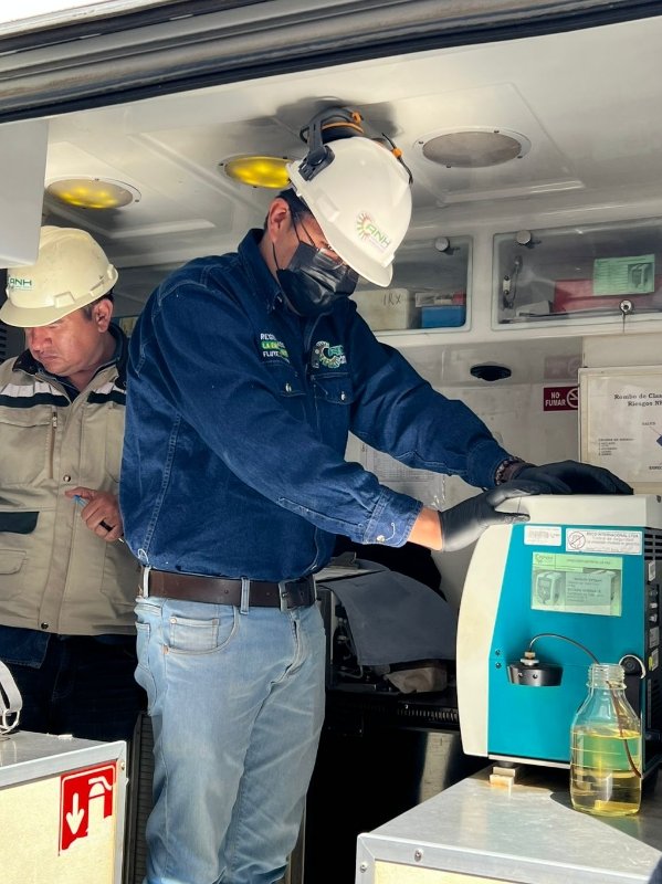 El procedimiento se realiza siguiendo un estricto protocolo técnico de análisis básico en el laboratorio móvil de la ANH. En primera instancia, se determina la gravedad específica de la muestra; posteriormente, ésta es introducida en el equipo que evalúa la proporción de mezcla de la gasolina en relación con el etanol. Finalmente, todos los resultados obtenidos son registrados en la planilla de control de calidad.
