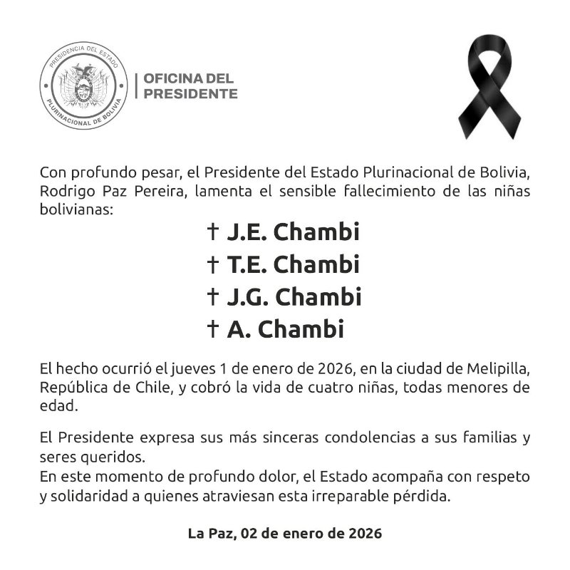La Paz, Bolivia /QAMASA Digital. – La Oficina del Presidente del Estado Plurinacional de Bolivia informa con profundo pesar que, el jueves 1 de enero de 2026, un incendio ocurrido en un cité ubicado en el pasaje Santa Teresa N.° 916, en la localidad de Melipilla, en las afueras de la ciudad de Santiago de Chile, provocó el fallecimiento de cuatro niñas bolivianas.