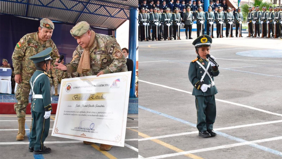 Durante la ceremonia, el general Zúñiga expresó que para el Ejército es un verdadero honor hacerle la entrega a Jhustin de una beca completa para que pueda completar todos sus estudios primarios en la Unidad Educativa del Ejército de Cochabamba y destacó la ferviente participación que tuvo el niño durante los actos de aniversario del Ejército, poniéndolo como ejemplo para todas las generaciones sobre el amor que se le debe mostrar a la patria.