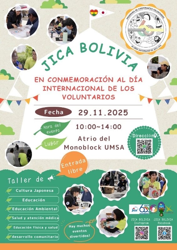 QAMASA Digital..- En el marco del Día Internacional de los Voluntarios, celebrado el 5 de diciembre, la Agencia de Cooperación Internacional del Japón (JICA) llevará a cabo una exposición para dar a conocer las actividades del Programa de Cooperantes Voluntarios Japoneses, el cual cumple 60 años a nivel global en esta gestión. El evento se desarrollará en el atrio de la Universidad Mayor de San Andrés, el sábado 29 de noviembre desde las 10:00 horas.