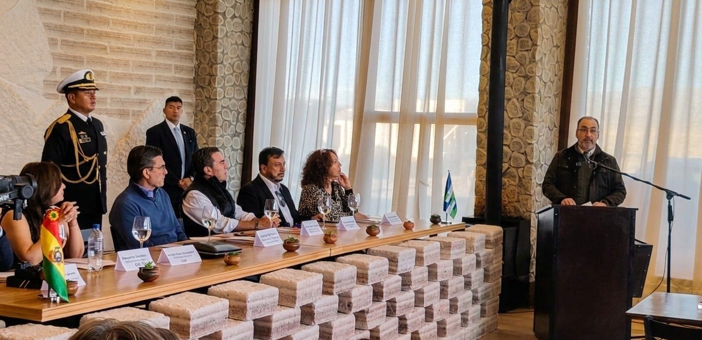 Uyuni, 26 de febrero, de 2026.- Bajo el sello de diversos convenios de apoyo técnico y económico de CAF hacia Bolivia, Cinthya Yáñez, titular de Turismo Sostenible, Culturas, Folklore y Gastronomía, lanzó la Marca Destino Salar de Uyuni y Lagunas de Colores. Asistieron el mandatario boliviano, Rodrigo Paz, y el jefe de CAF, Sergio Díaz.