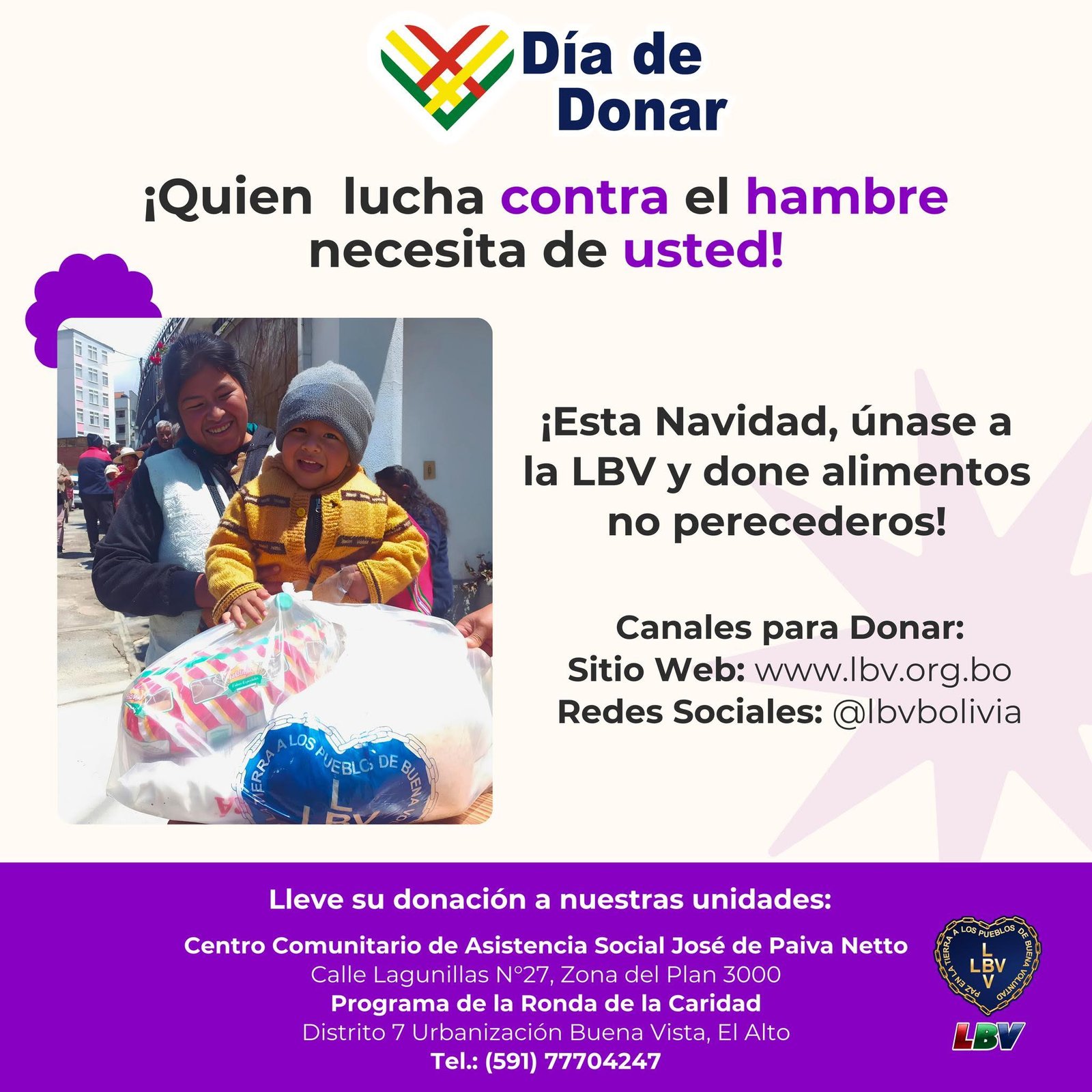 Si desea ser parte de este esfuerzo solidario o colaborar con futuras campañas, lo invitamos a contactarse con nosotros al WhatsApp 69107575. También puede visitar nuestras redes sociales: @lbvbolivia, sitio web: lbv.org.bo para conocer más sobre nuestras actividades y proyectos en beneficio de los más necesitados.