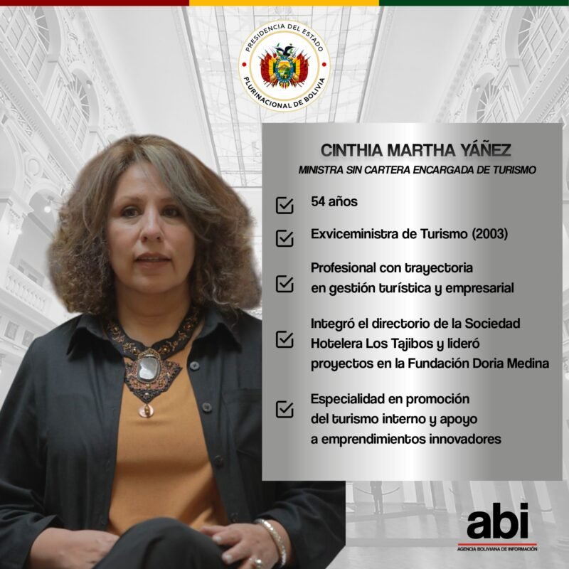 La Paz, Bolivia/QAMASA Digital. – Cinthya Martha Yáñez comanda desde este domingo el nuevo ministerio sin cartera de Turismo y Gastronomía, con el objetivo de fomentar y gestionar cooperación para impulsar estos rubros de la economía nacional.