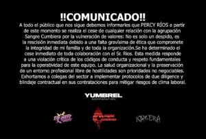 La Paz, Bolivia /QAMASA Digital. – La agrupación Sangre Cumbiera anunció oficialmente la desvinculación de su cantante Percy Ríos, según un comunicado difundido en sus redes sociales. La decisión se habría tomado por presuntos actos de mala conducta, situación que —según la publicación— va en contra de los principios y la línea de trabajo del grupo musical.