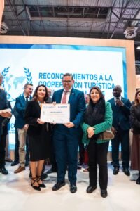 La ceremonia de reconocimiento se desarrolló en el stand del Perú en FITUR y estuvieron presentes la Ministra de Comercio Exterior y Turismo del Perú, Teresa Mera; Cinthya Yáñez, Ministra de Turismo Sostenible, Culturas, Folklore y Gastronomía del Estado Plurinacional de Bolivia; y Sofía Cañón, Directora de Inversión Extranjera y Servicios del Ministerio de Comercio, Industria y Turismo de Colombia.