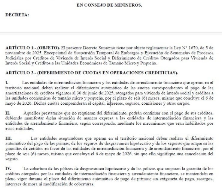 “El presente Decreto Supremo tiene por objeto reglamentar la Ley N° 1670, de 5 de noviembre de 2025, Excepcional de Suspensión Temporal de Embargos y Ejecución de Sentencias de Procesos Judiciales por Créditos de Vivienda de Interés Social y Diferimiento de Créditos Otorgados para Vivienda de Interés Social y Créditos a las Unidades Económicas de Tamaño Micro y Pequeña”, se lee en el primer artículo.