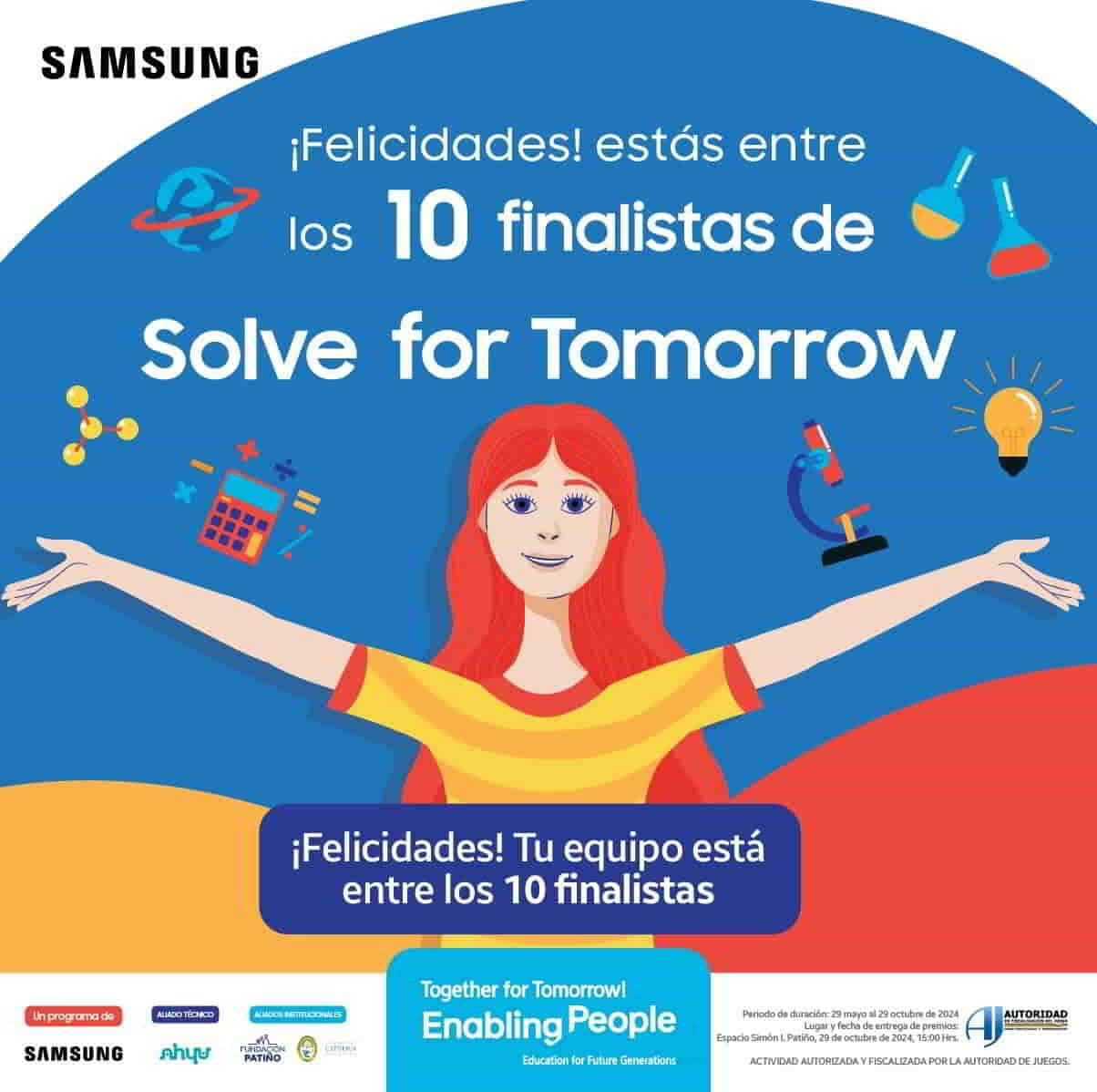 «Los cinco finalistas trabajarán en los prototipos funcionales de sus proyectos, y conoceremos al ganador de esta segunda edición de Solve for Tomorrow el próximo 29 de octubre. Nos acercamos a la fase final y todos estamos emocionados por descubrir los trabajos que traerán beneficios a sus comunidades», concluyó la ejecutiva de Samsung.